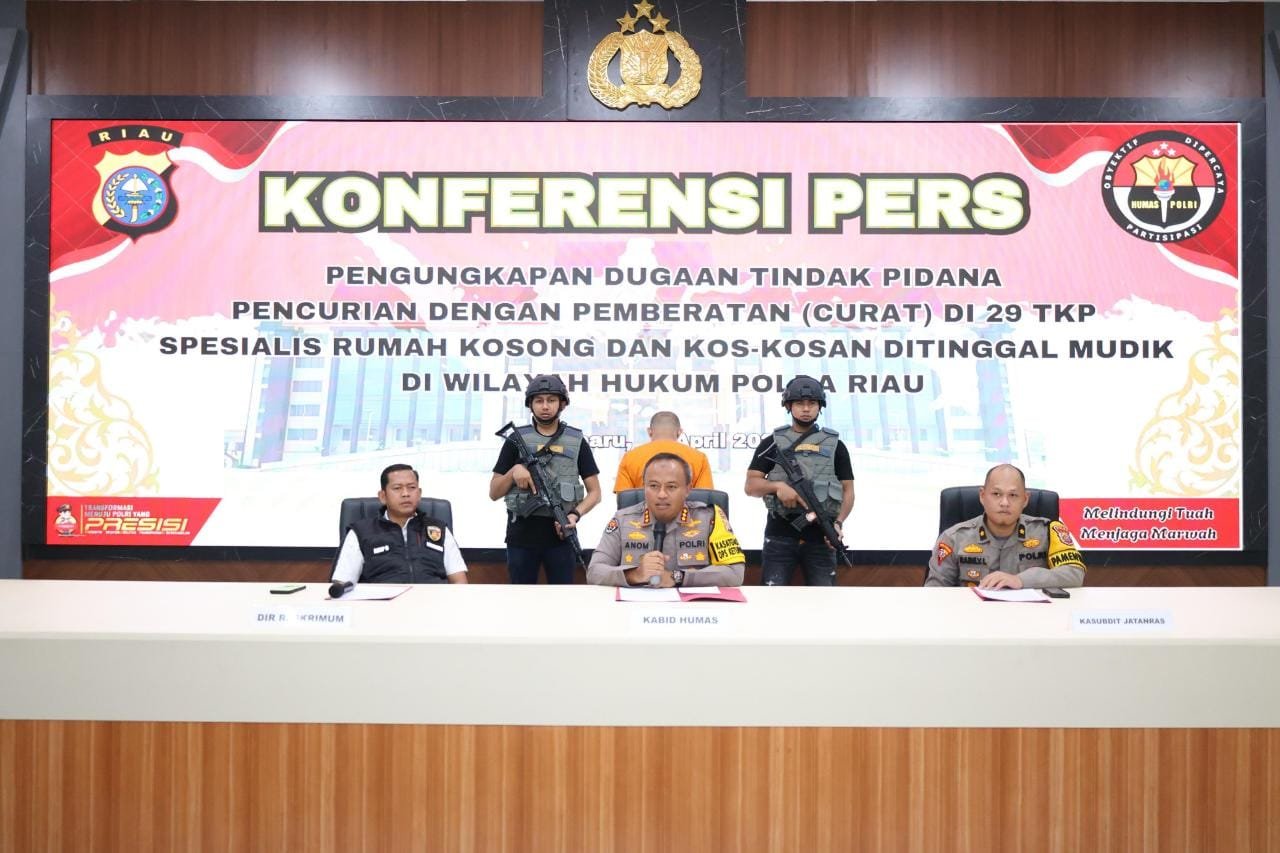 Foto : Polda Riau Konferensi Pers di Gedung Media Center Mapolda Riau Terkait Pengungkapan Tindak Pidana Curat Pembobol Rumah Spesialis