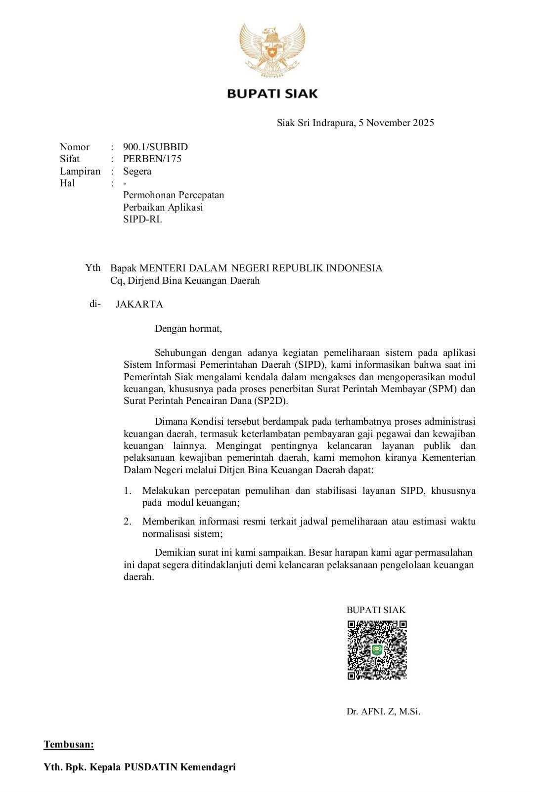 SIAK, Suaraaspirasi.com – Bupati Siak Afni Zulkifli mendapatkan laporan bahwa Sistem Informasi Pemerintahan Daerah (SIPD) Kementerian Dalam Negeri mengalami gangguan, akibatnya terjadi keterlambatan penyaluran gaji ASN dan tenaga honorer Kabupaten Siak.