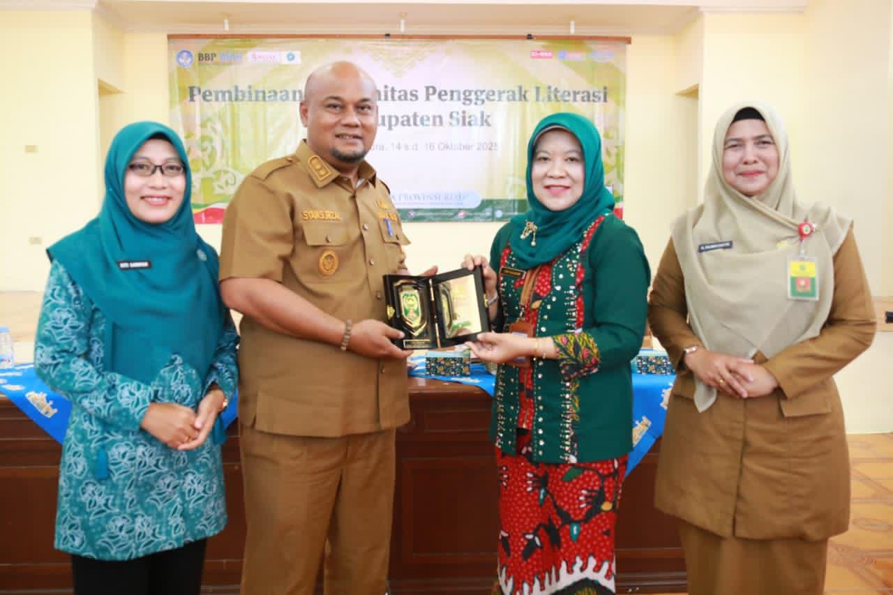 Syamsurizal, mewakili Bupati Siak sebagai Bunda Literasi Kabupaten Siak, hadir didampingi Ketua TP PKK Kabupaten Siak hadir untuk membuka kegiatan Pembinaan bagi para Komunitas Penggerak Literasi di Kabupaten Siak